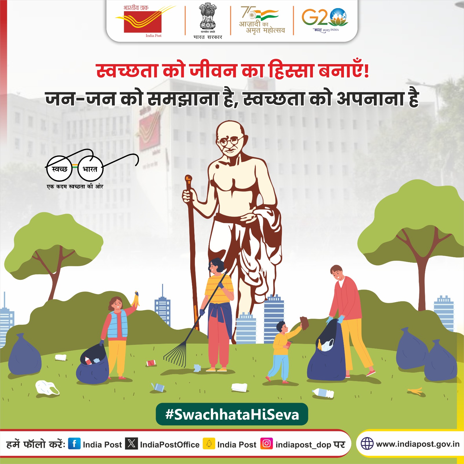 देशभर में स्वच्छता अभियान ज़ोर—शोर से जारी है। डाक विभाग का आप सभी से निवेदन है कि अपने आसपास स्वच्छता बनाए रखने का प्रण लें और देश को सुंदर बनाएं।